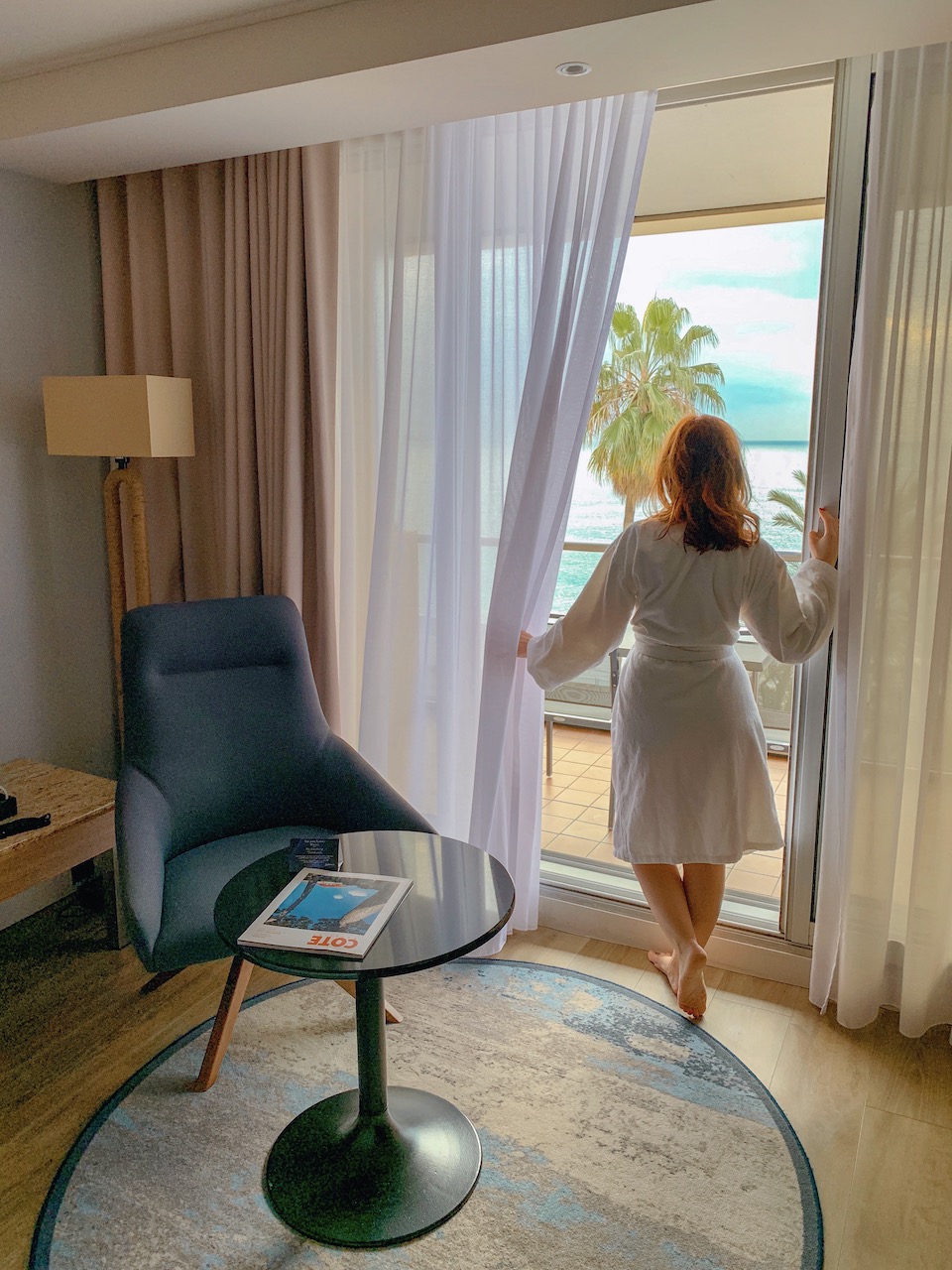 Nous venons de temps en temps déjeuner avec mon patron sur leur rooftop où se trouve l’excellent restaurant que j’affectionne particulièrement « La Calade ». On y mange très bien (cuisine méditerranéenne) et la vue panoramique sur la baie niçoise est époustouflante. J’avais eu l’opportunité de visiter les chambres mais pas encore d’y séjourner …